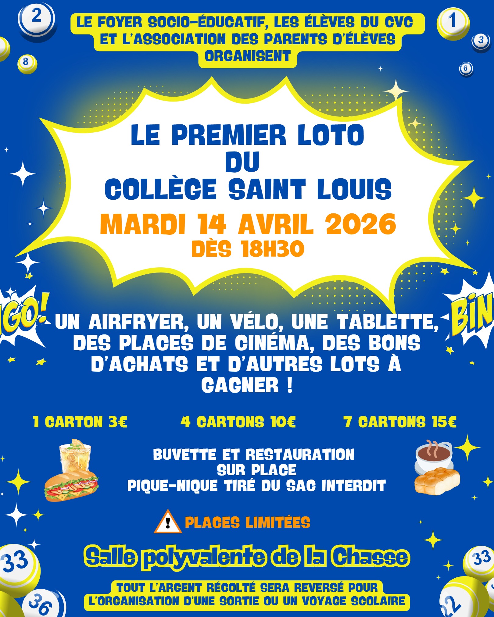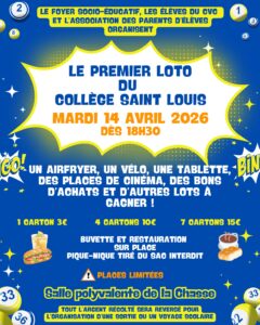 L’association des parents d’élèves, le CVC et le foyer socio-éducatif du collège ont le plaisir de vous inviter à leur premier loto !