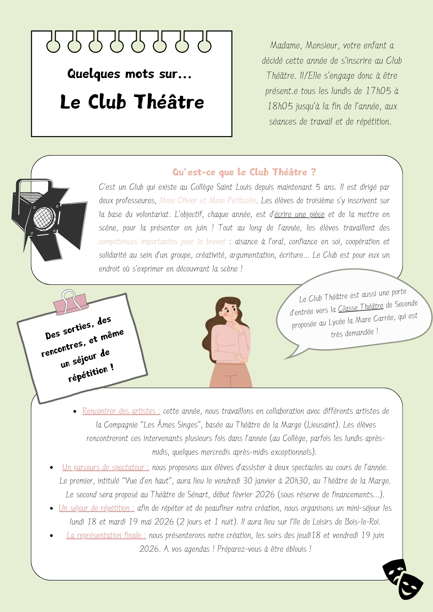 Depuis maintenant cinq ans, le Club Théâtre du collège Saint Louis réunit chaque année des élèves volontaires de troisième désireux de s’engager dans une aventure artistique exigeante… et passionnante ! Co-animé par Mme Olivier et Mme Petitcolin, ce club est devenu un rendez-vous incontournable pour celles et ceux qui aiment jouer, créer et s’exprimer.