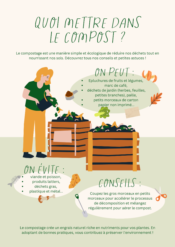 Des bacs dédiés ont été installés au restaurant scolaire pour collecter les restes comestibles destinés aux poules. Élèves et personnels participent chaque jour à ce geste concret en faveur de l’environnement. Une partie des déchets alimentaire viendra également alimenter le compost mit en place par les élèves.